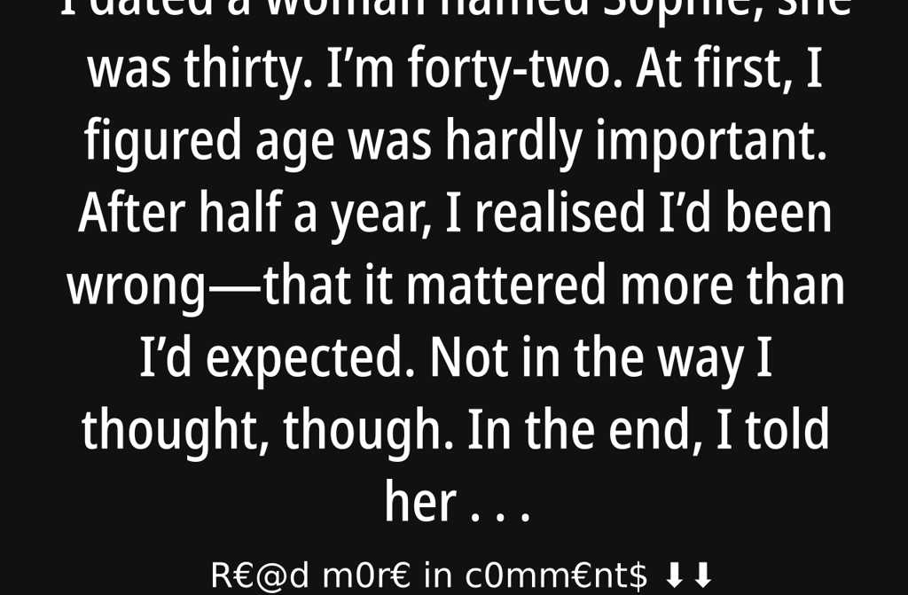 I dated a woman named Sophie, she was thirty. Im forty-two. At first, I figured age was hardly important. After half a year, I realised Id been wrongthat it mattered more than Id expected. Not in the way I thought, though. In the end, I told her to leave, and it was a real row.