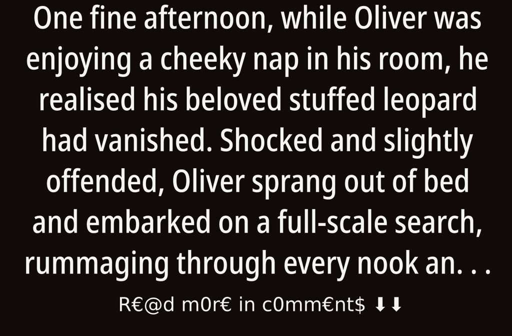 One fine afternoon, while Oliver was enjoying a cheeky nap in his room, he realised his beloved stuffed leopard had vanished. Shocked and slightly offended, Oliver sprang out of bed and embarked on a full-scale search, rummaging through every nook and cranny of the house. Despite his finest detective efforts, there was no sign of the furry companion, so Oliver was forced to accept the tragic idea that his best friend had packed its bags and left town without so much as a goodbye.