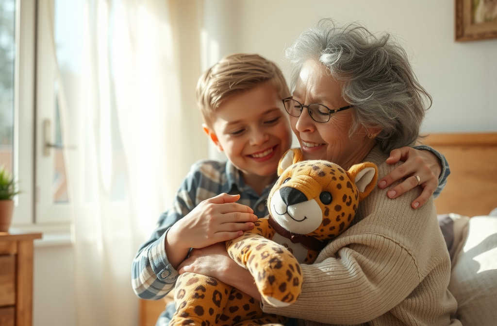 Liams grandmother mended the stuffed animal with such care and attention to detail that it looked as good as new. Liam was overjoyed and hugged her, thanking her sincerely for restoring his favourite toy.