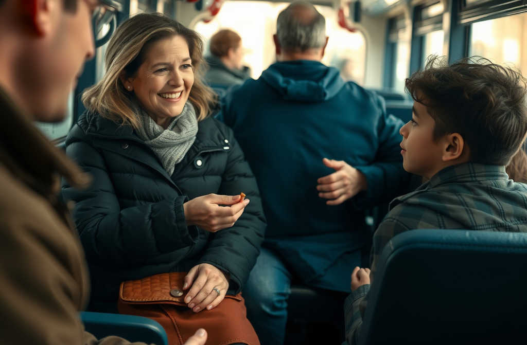 The bus was packed to the brim, every seat taken. I spotted a young man listening to music through his headphones and kindly asked if hed mind giving up his seat. He immediately stood and offered it, and my son, grateful, handed him a sweet with a shy smile. The young man looked a bit embarrassed but smiled back warmly.