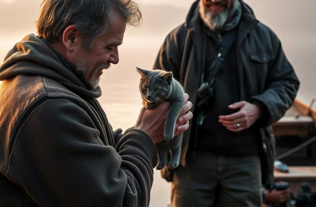 Grey looked at me, mewed apologetically, and shuffled toward the boatman, planting his front paws on the mans massive boots. The man lifted him, and the big grey tom wrapped his paws around his neck, purring against the gruffs chest.