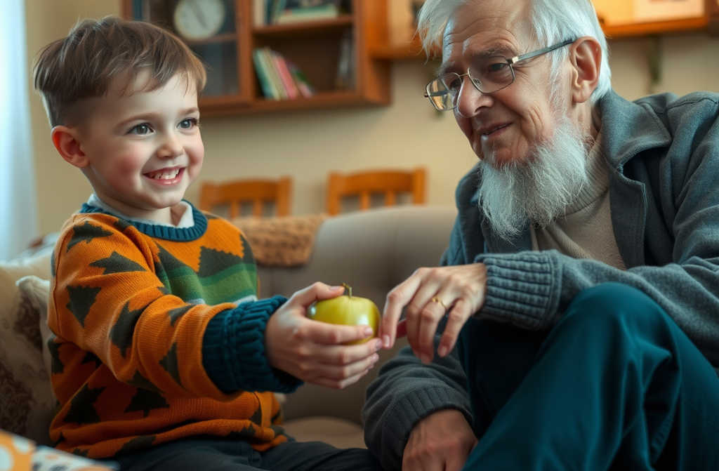 After growing up, studying at university, and finally landing a good job, I never left Granddads side. We continued living together with my own family. On my last birthday, I decided to give Granddad a sock with a green apple stitched onto it. He was overjoyed, declaring that now a magic apple would appear in his sock every day.
