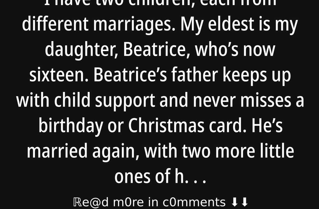 I have two children, each from different marriages. My eldest is my daughter, Beatrice, whos now sixteen. Beatrices father keeps up with child support and never misses a birthday or Christmas card. Hes married again, with two more little ones of his own, but he hasnt forgotten about his firstborn. Credit where credits duehes not one to duck out of family obligations, however complicated.