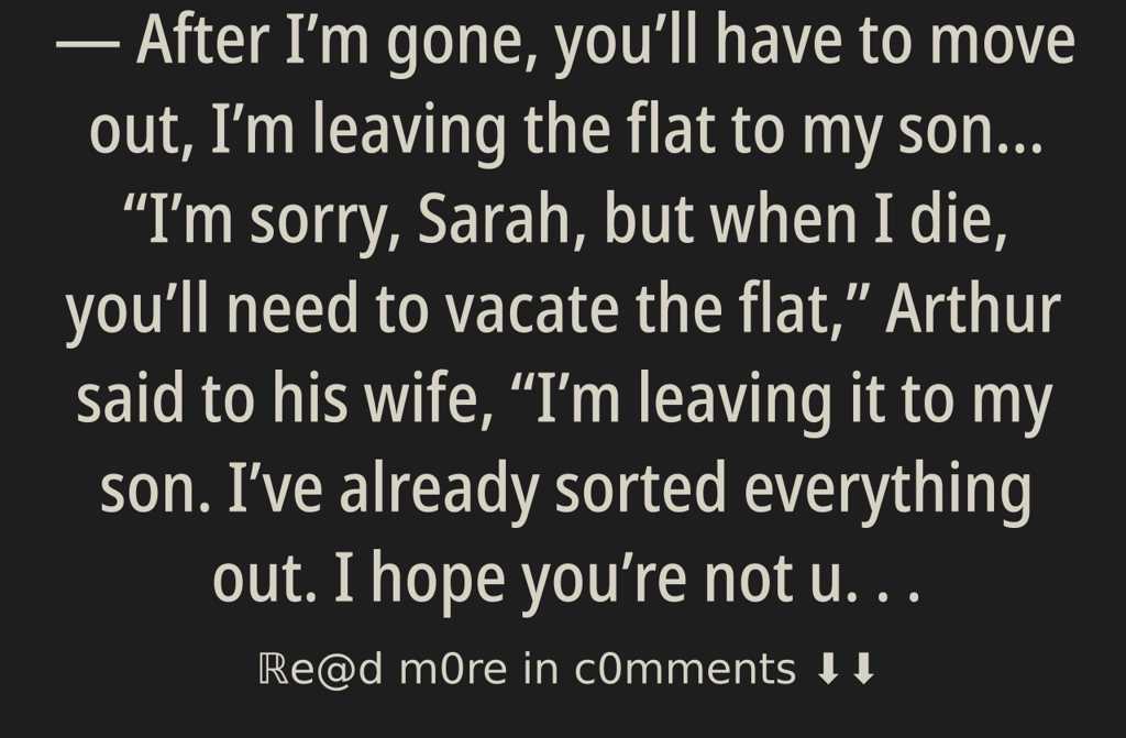Im sorry, Sarah, but when I die, youll need to vacate the flat, Arthur said to his wife, Im leaving it to my son. Ive already sorted everything out. I hope youre not upset with me for this? Youve got your own children, theyll look after you.