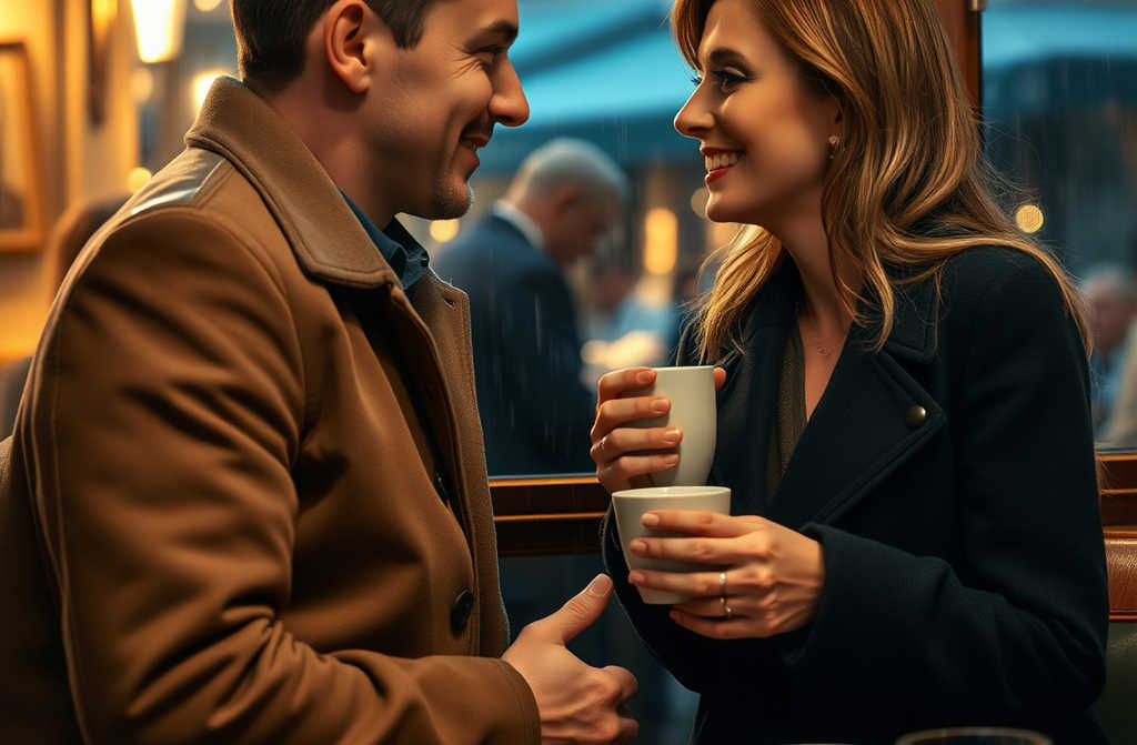 He settled for a kebab, opened the music app, and sipped his wine when a chair scraped back. A woman slipped into the seat opposite him, rain droplets peppering her coat, hair slick, eyes flickering with something unreadable.