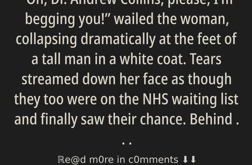 Oh, Dr. Andrew Collins, please, Im begging you! wailed the woman, collapsing dramatically at the feet of a tall man in a white coat. Tears streamed down her face as though they too were on the NHS waiting list and finally saw their chance. Behind the maze of faded consulting rooms and the ever-present smell of disinfectant, in the A&E of a sleepy English village hospital, her only child was fighting for his life.