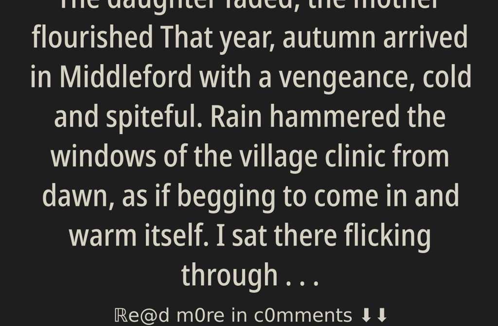 That year, autumn arrived in Middleford with a vengeance, cold and spiteful. Rain hammered the windows of the village clinic from dawn, as if begging to come in and warm itself. I sat there flicking through patient files, heart weighed down with worry despite the hushno serious illnesses around, but anxiety hovered like gnats before a storm, endlessly swirling.