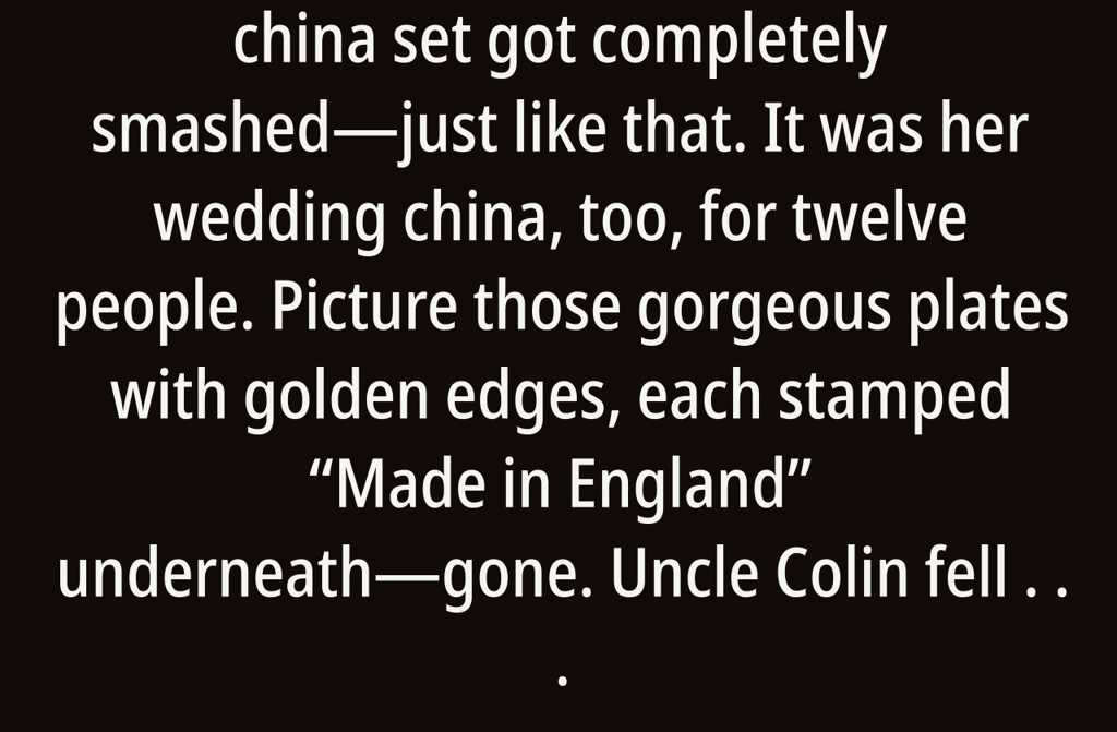 So, listen to this. My Aunt Rachels china set got completely smashedjust like that. It was her wedding china, too, for twelve people. Picture those gorgeous plates with golden edges, each stamped Made in England underneathgone. Uncle Colin fell off the loft with the box in his arms.