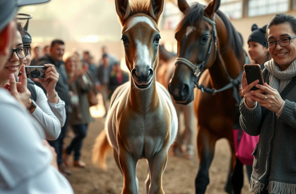 Rather than shying away from the commotion and clattering applause, the little foalactually a sprightly Clydesdaleseemed to revel in the mania. He threw back his head, perked his ears, and stamped his hooves in a perky prance, basking oddly in all the applause and flashes, as though he too were haunted by the logic of dreams.
