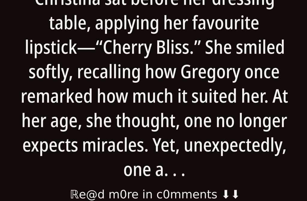 Christina sat before her dressing table, applying her favourite lipstickCherry Bliss. She smiled softly, recalling how Gregory once remarked how much it suited her.
