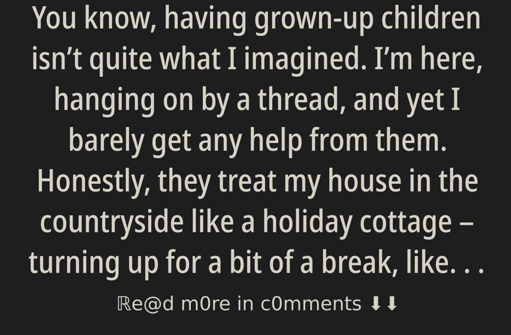 You know, having grown-up children isnt quite what I imagined. Im here, hanging on by a thread, and yet I barely get any help from them. Honestly, they treat my house in the countryside like a holiday cottage turning up for a bit of a break, like theyre on a spa weekend. And me? Oh, Im the maid service: welcoming them, feeding them, tidying up after everyone, ferrying around the grandkids. I dont even get help, let alone anything towards the shopping or bills.