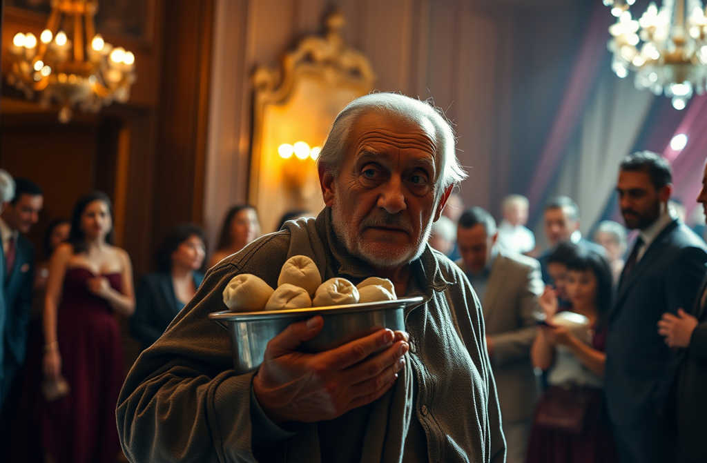 Her father hesitated at the edge of the room, ashamed of his worn jacket and dusty boots.