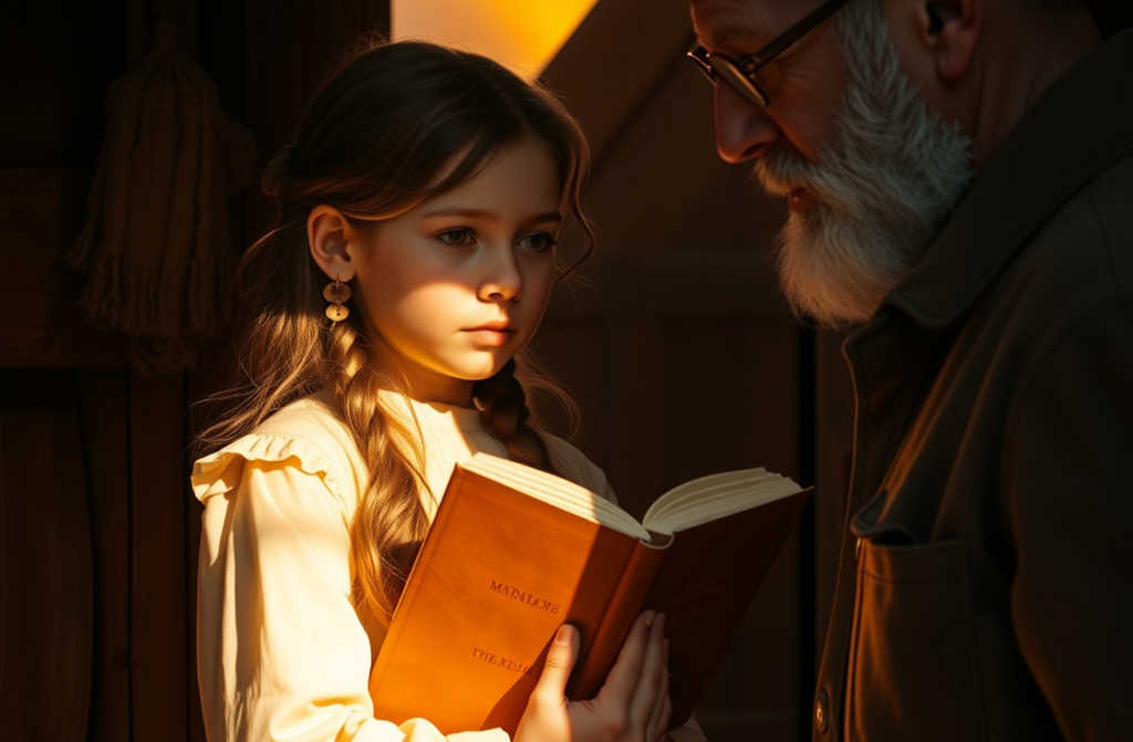The village now had a modern clinic, a small lab, and a team of young volunteers. A painting hung in the hallwaya little girl and a man holding a thick book in the rain.