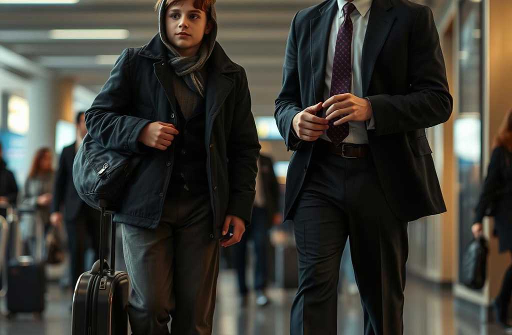 The cry was sharp, desperate, cutting through the clamour of Heathrow Airports bustling terminal. Dozens of travellers turned their heads, searching for the source. Near a row of vending machines stood a scrawny lad in tattered clothes, his hair matted, a frayed rucksack slung over one shoulder. His eyes were fixed on a mantall, polished, dressed in a navy-blue suit, carrying a sleek briefcase.
