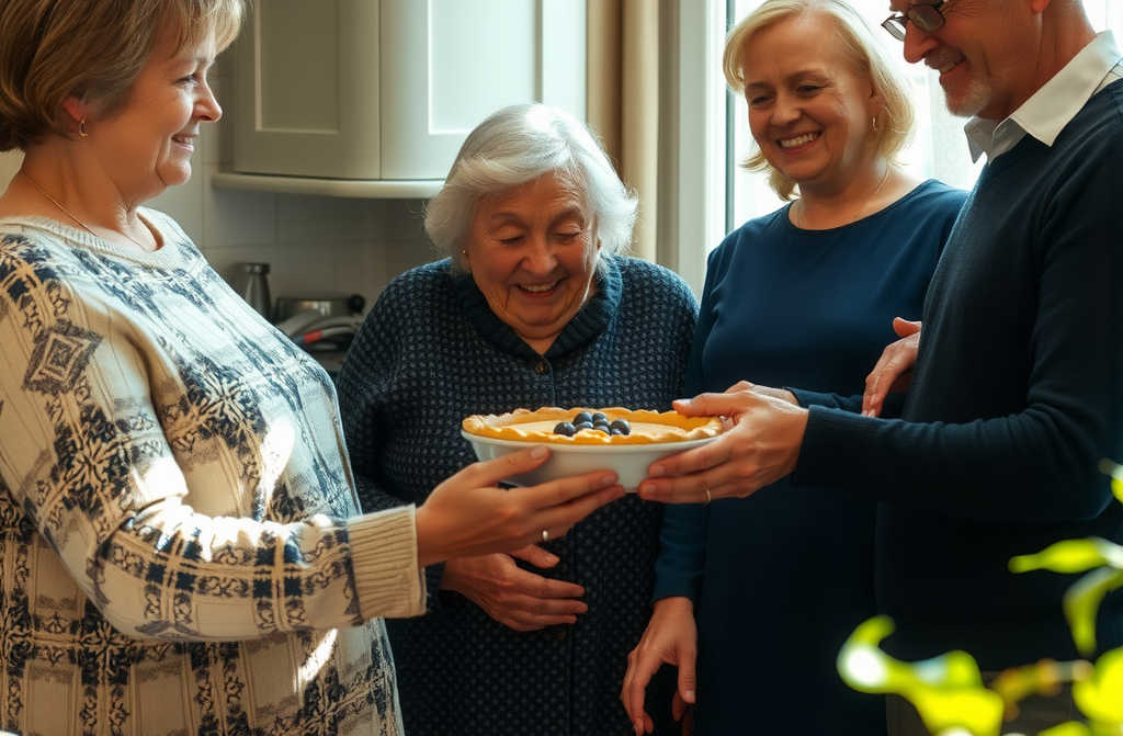 I baked a pie, she said. Far too much for just me.