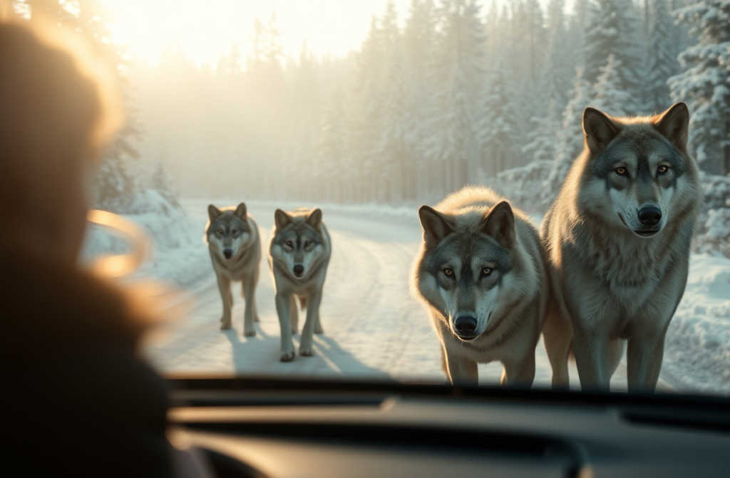 They emerged from the trees, moving with eerie calm, almost as if time itself had slowed down for them. Their grey coats blended perfectly with the snow, and the beam of my headlights caught their eyes, gleaming yellow in the gloom.