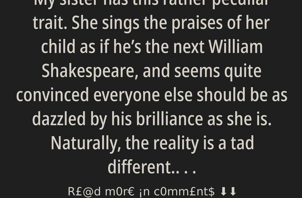 My sister has this rather peculiar trait. She sings the praises of her child as if hes the next William Shakespeare, and seems quite convinced everyone else should be as dazzled by his brilliance as she is. Naturally, the reality is a tad different.