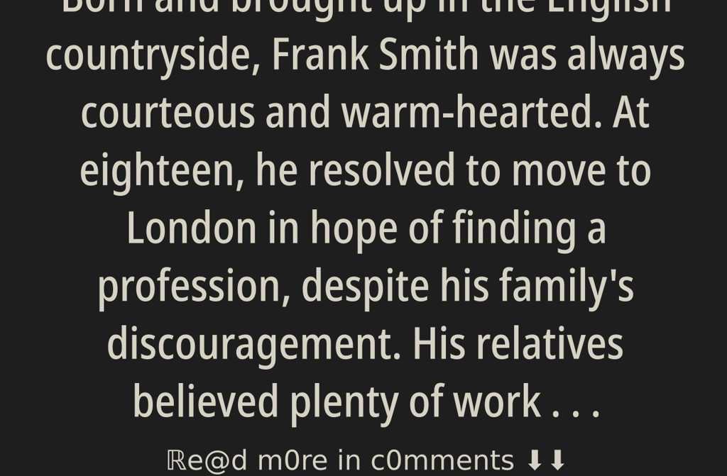 Born and brought up in the English countryside, Frank Smith was always courteous and warm-hearted. At eighteen, he resolved to move to London in hope of finding a profession, despite his family’s discouragement. His relatives believed plenty of work could be found at home, but Frank was determined and paid little heed to their warnings.