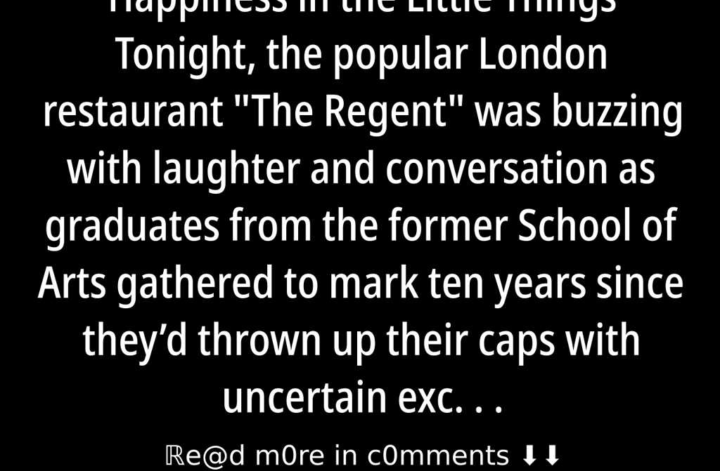 Tonight, the popular London restaurant “The Regent” was buzzing with laughter and conversation as graduates from the former School of Arts gathered to mark ten years since theyd thrown up their caps with uncertain excitement and collected their diplomas. Back then, the world felt wide openso many possibilities, so much yet unknown. As the years rolled by, each of them had taken their own unique turn, and tonight, excitement mixed with nerves as everyone wondered who they’d see, whod changed, and how life had steered them.