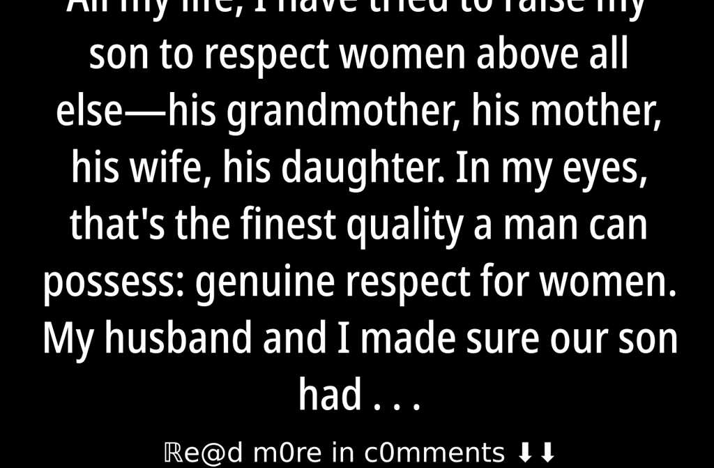 All my life, I have tried to raise my son to respect women above all elsehis grandmother, his mother, his wife, his daughter. In my eyes, that’s the finest quality a man can possess: genuine respect for women. My husband and I made sure our son had the finest education, the right values and every opportunity for a bright future. We meant to step back and let him stand on his own. Still, we quietly bought him a two-bedroom flat. He worked hard and covered his own expenses, but owning a place in London was simply out of reach for him.