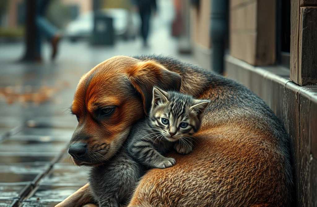 By summer, the kitten grew. The dog grew thinner. Autumn brought endless rain, and dry spots were scarce. Sometimes, the dog curled around his kitten, shielding it from the cold, shivering himself but licking the little one dry.