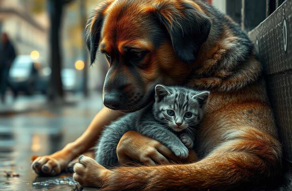 He found softer scraps, chewed them up for his kitten. The kitten ate, then cuddled close. He hugged his dog-mother, played with his tail, slept curled against him. And somehow, the dog felt warm. Safe.