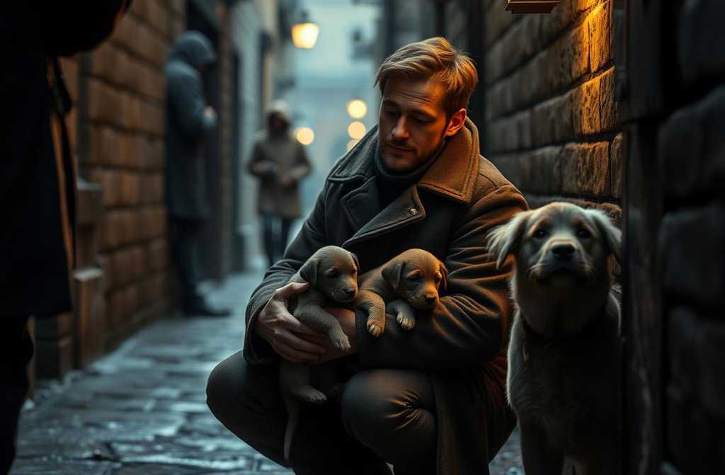 There, at the bottom of the soggy sack, huddled together in a trembling heap, were two tiny puppies. They were blind, fur slick with rain and dirt, but alive. Their little bodies rose and fell with each breath. Leo, heart hammering, reached in and lifted one. It fit perfectly in his palm fragile, helpless. He scooped the second, pressed both close to his chest, tucked them under his coat, trying to warm them with his own heat. He could feel their tiny hearts beating in time with his own, frantic pulse.