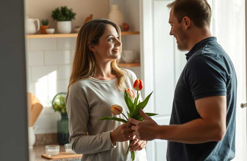 Yes, the groceries are in the car. I actually brought a little something for you. He rummaged in the bag and pulled out a modest bunch of tulips, handing them over.