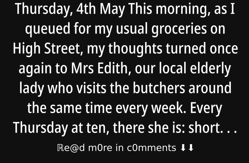 This morning, as I queued for my usual groceries on High Street, my thoughts turned once again to Mrs Edith, our local elderly lady who visits the butchers around the same time every week. Every Thursday at ten, there she is: short, with her back curved gently by the weight of yearstrailing her old shopping trolley behind her.