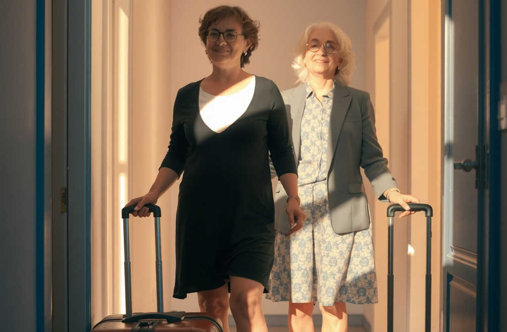 Standing outside was Nina, the younger sister. She came burdened with two enormous suitcases, a hand bag slung across her shoulder, and the look of a woman who had at last made a grand life decision and couldnt be more chuffed about it.