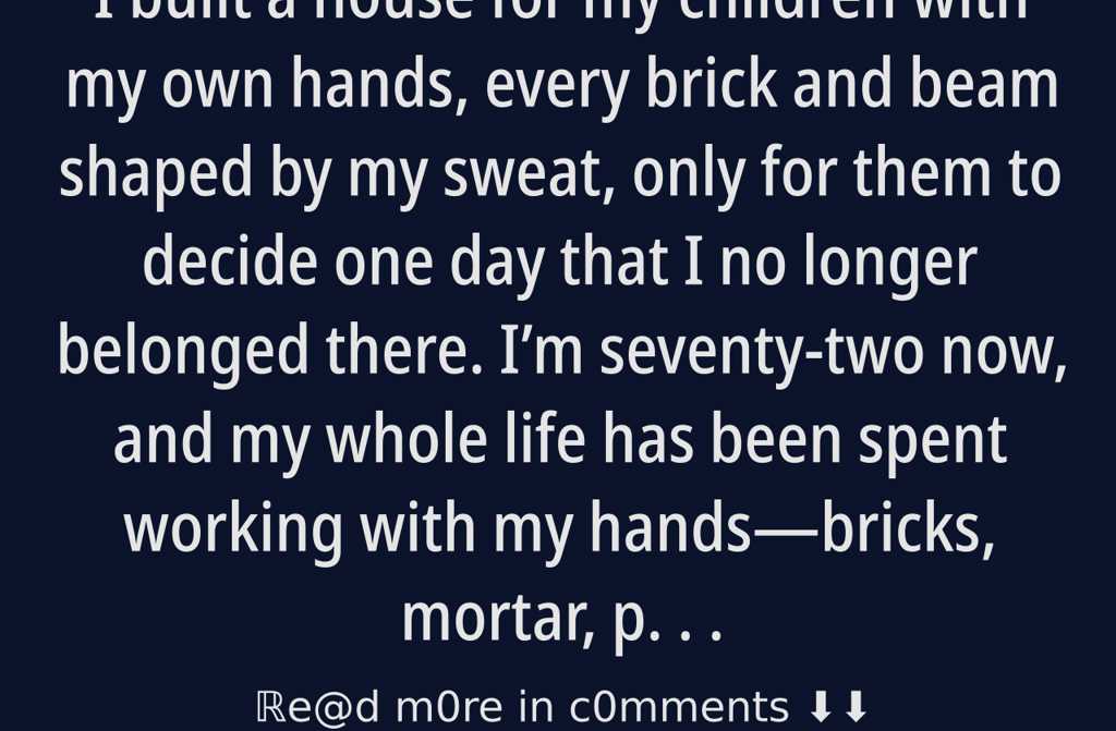 I built a house for my children with my own hands, every brick and beam shaped by my sweat, only for them to decide one day that I no longer belonged there. Im seventy-two now, and my whole life has been spent working with my handsbricks, mortar, plaster, tiles. This was my craft. My pride.
