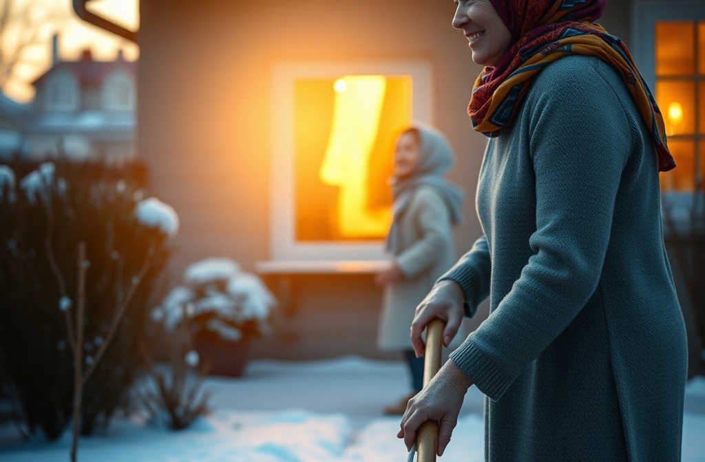 On the second of January, she was up with the lark again. I heard the door bang, peeked out the window, and saw her shovelling the garden path in her old puffer coat with a headscarf tied under her chin. She worked steadily, from the front gate right up to our doorstep, neat and straight as ever. Piles of snow lined the path just the way she liked it.