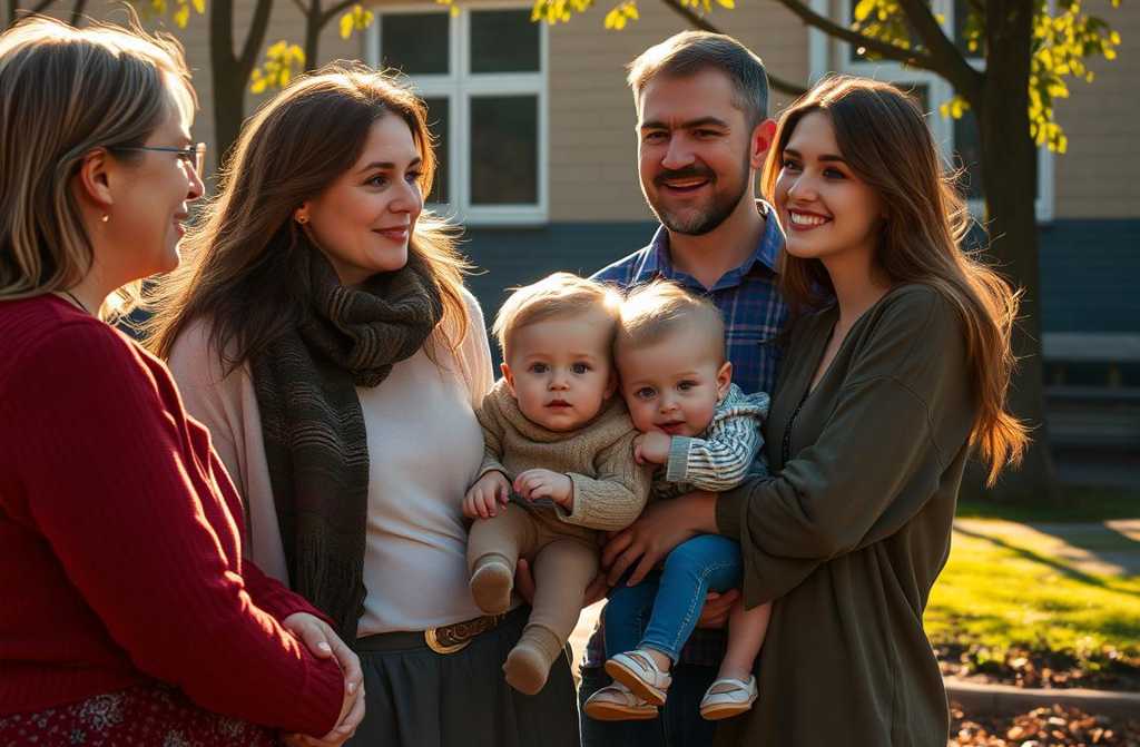 In the courtyard below stands Ethan Ustin, cradling two toddlers in his arms. Beside him is a young woman, about twenty, her eyes a striking shade of blue.