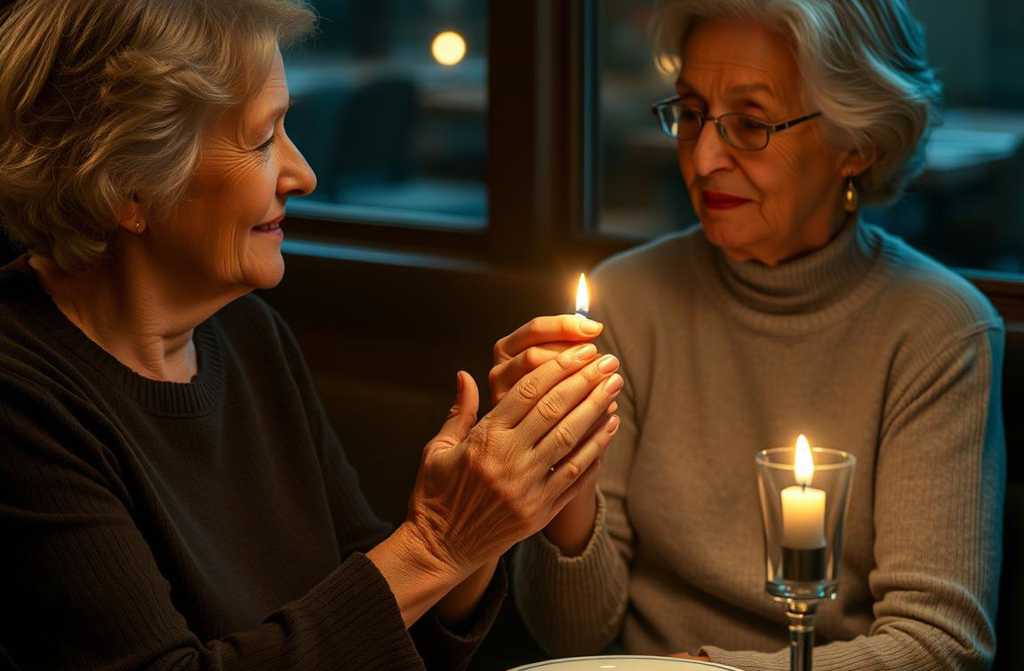 Harriet rose, walked around the table, and hugged Blythes shoulders. Blythes wooden chair creaked, shoulders trembling. The waiter shifted nearby, unsure whether to intervene.