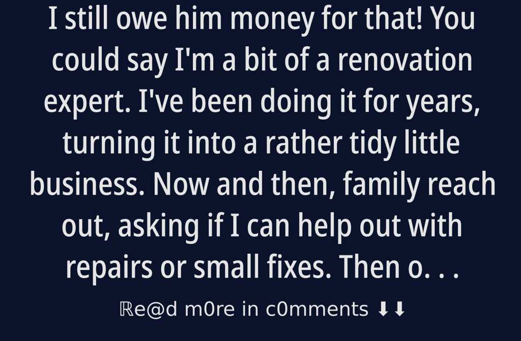 You could say I’m a bit of a renovation expert. I’ve been doing it for years, turning it into a rather tidy little business. Now and then, family reach out, asking if I can help out with repairs or small fixes. Then one day, my cousin rings me up. I answer, and it’s him. Thought Id better call and ask for your help, mate.