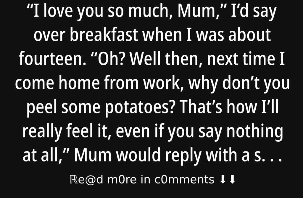 Oh? Well then, next time I come home from work, why dont you peel some potatoes? Thats how Ill really feel it, even if you say nothing at all, Mum would reply with a smile.