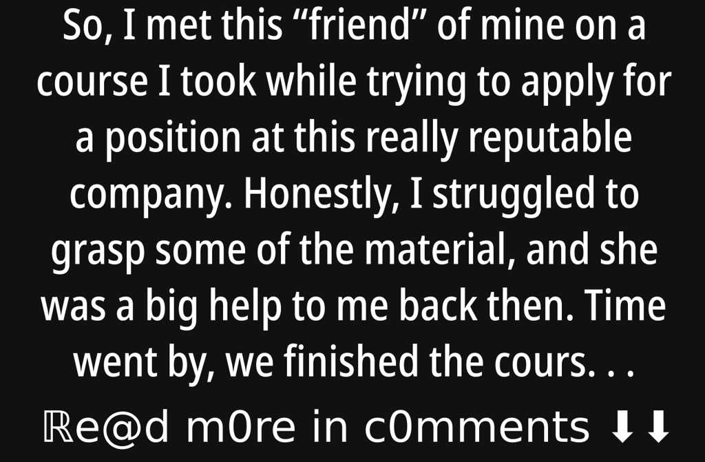 So, I met this friend of mine on a course I took while trying to apply for a position at this really reputable company. Honestly, I struggled to grasp some of the material, and she was a big help to me back then. Time went by, we finished the course and stayed in touch. She was still living off her parents, while I was married and didnt have that cushion of support.