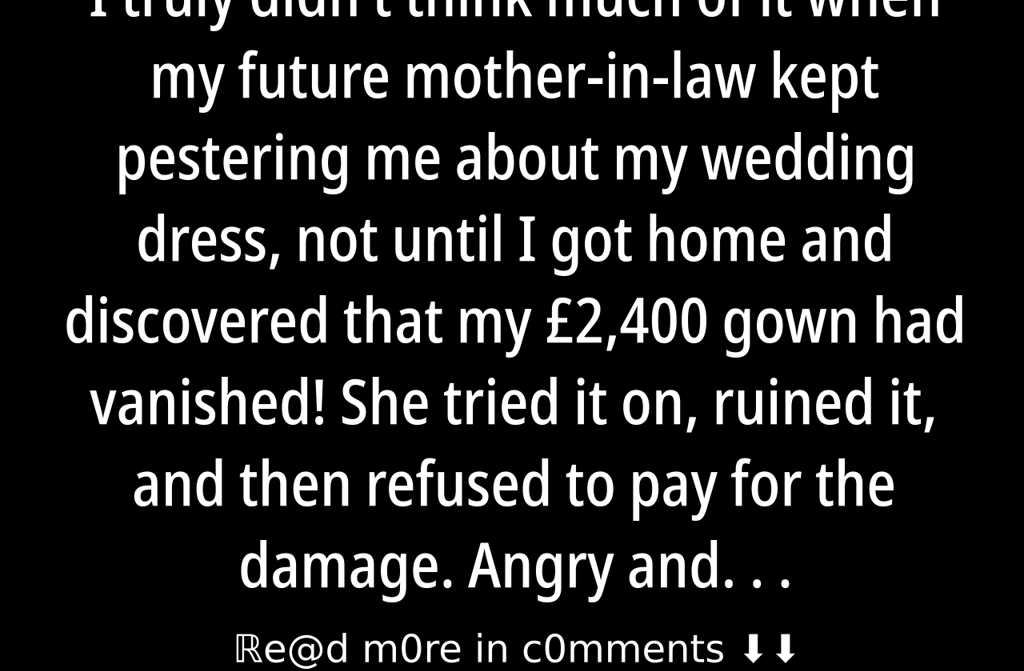 I truly didnt think much of it when my future mother-in-law kept pestering me about my wedding dress, not until I got home and discovered that my £2,400 gown had vanished! She tried it on, ruined it, and then refused to pay for the damage. Angry and desperate, I confronted herarmed with a secret weapon that changed everything.