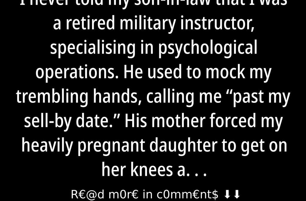 I never told my son-in-law that I was a retired military instructor, specialising in psychological operations. He used to mock my trembling hands, calling me past my sell-by date. His mother forced my heavily pregnant daughter to get on her knees and scrub the kitchen floor. I endured all of it in silence. But when he whispered to my grandson, Cry again and youll sleep in the shed, I finally spoke. Quietly. Calmly. Every adult in the room froze.