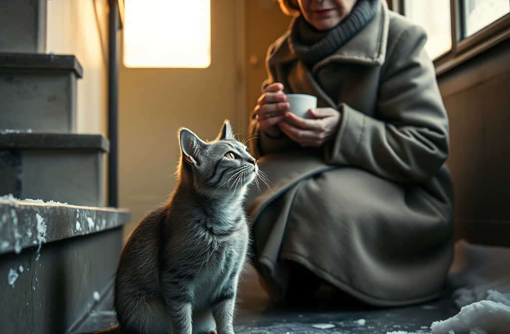 The cat, slipped in behind someone, huddled by the radiator, barely breathing. Its fur was icy, eyes pleading and exhausted.