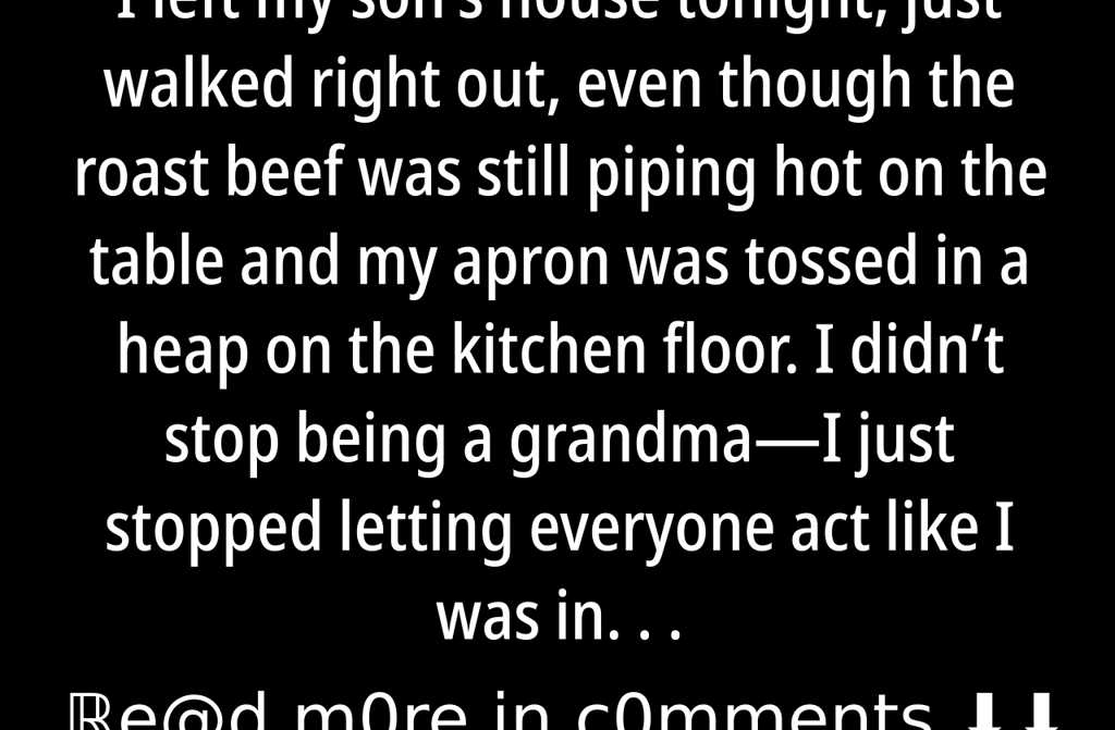 I left my sons house tonight, just walked right out, even though the roast beef was still piping hot on the table and my apron was tossed in a heap on the kitchen floor. I didnt stop being a grandmaI just stopped letting everyone act like I was invisible.