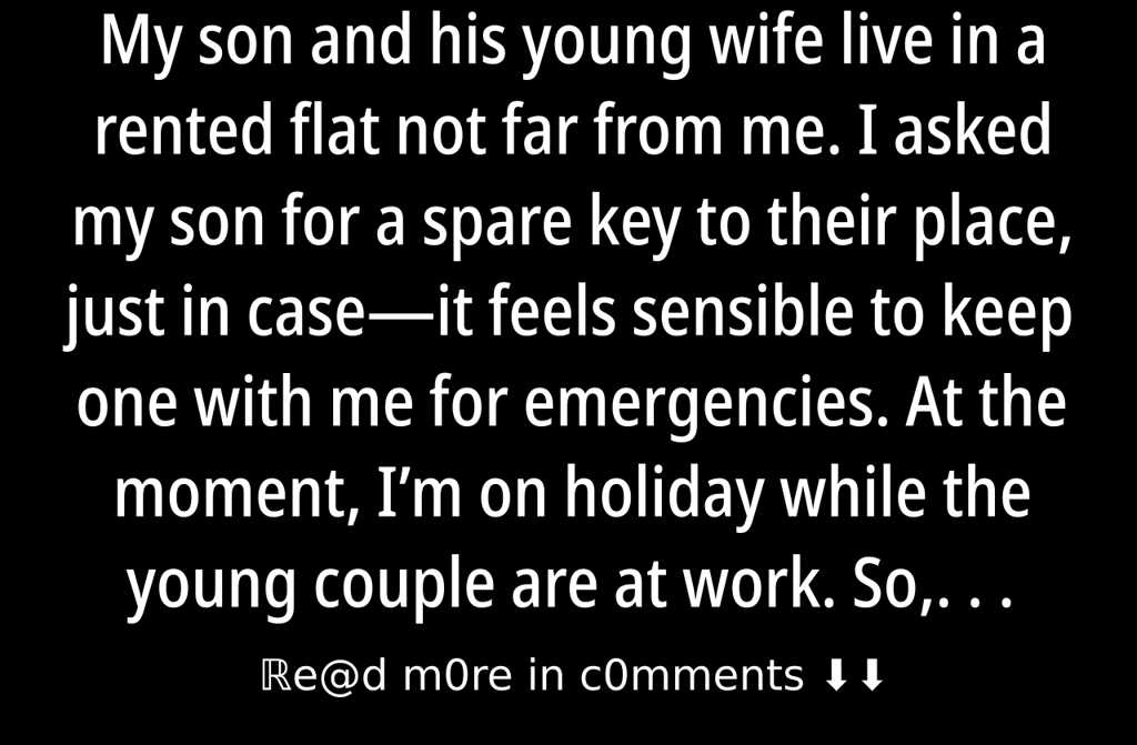 My son and his young wife live in a rented flat not far from me. I asked my son for a spare key to their place, just in caseit feels sensible to keep one with me for emergencies. At the moment, Im on holiday while the young couple are at work.