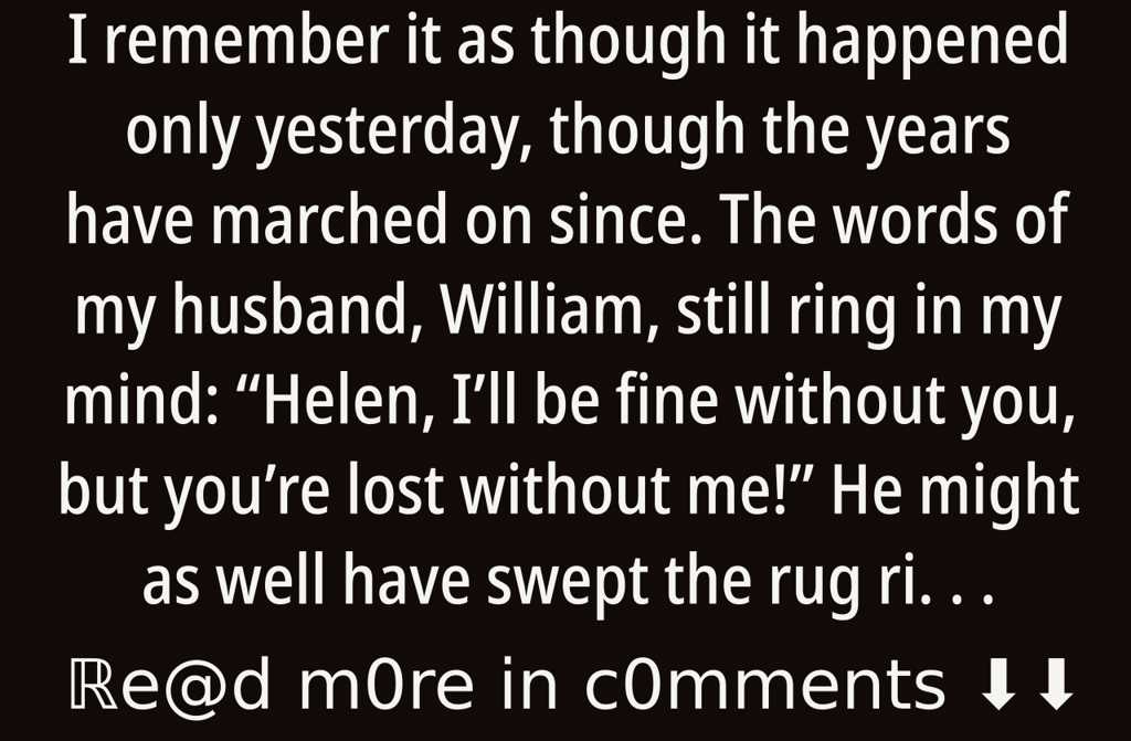 I remember it as though it happened only yesterday, though the years have marched on since. The words of my husband, William, still ring in my mind: Helen, Ill be fine without you, but youre lost without me! He might as well have swept the rug right out from under my feet; it wasnt just hurtfulit was a challenge aimed straight at my very heart. Did he truly believe I was weak, dependent on him, that my world would fall apart without him? Well, Id show him. From that day on, I resolved that I would no longer be an accessory in his life. I took a part-time job to build something of my ownno thanks to his so-called concern. He needed to see that I would not simply survive, but become stronger than he could ever imagine.