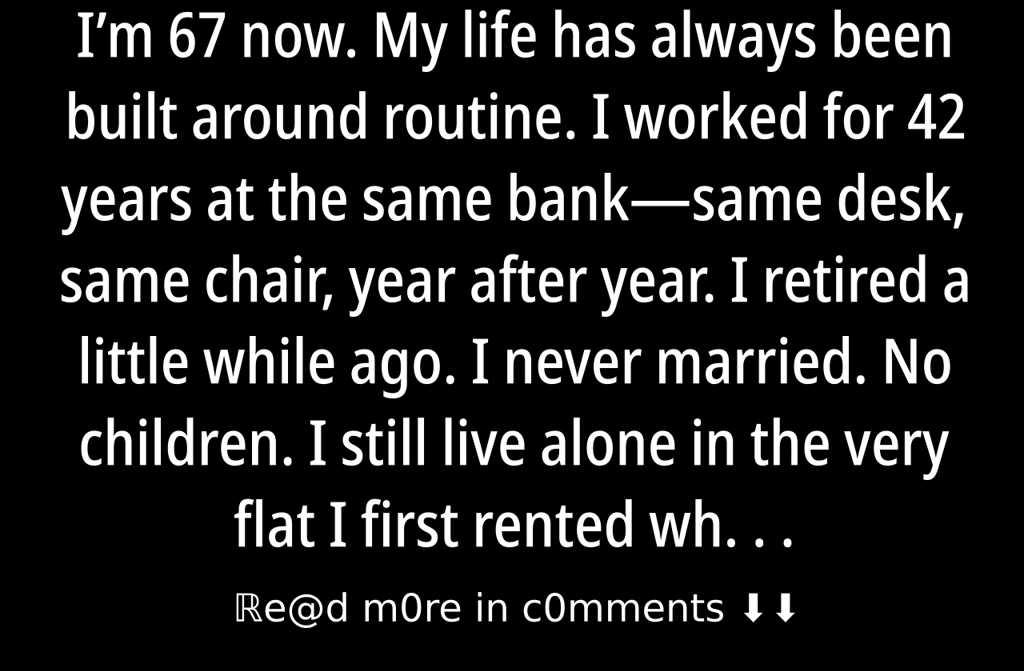 Im 67 now. My life has always been built around routine. I worked for 42 years at the same banksame desk, same chair, year after year. I retired a little while ago. I never married. No children. I still live alone in the very flat I first rented when I was 28.