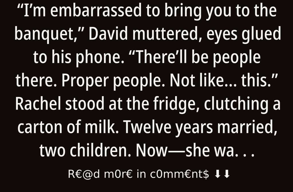 Im embarrassed to bring you to the banquet, David muttered, eyes glued to his phone. Therell be people there. Proper people. Not like this.
