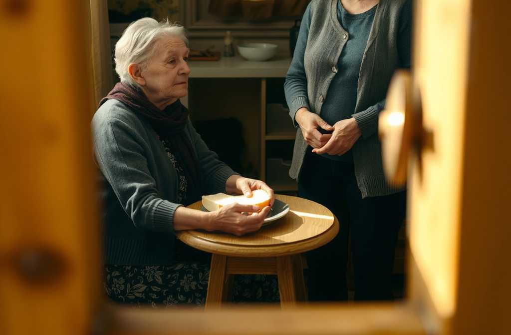 I stood, unpacked bread and cheese. Found a plate on her shelf and a knife with a worn wooden handle. Cut a slice, spread the butter, topped it with cheese, and set it before her.