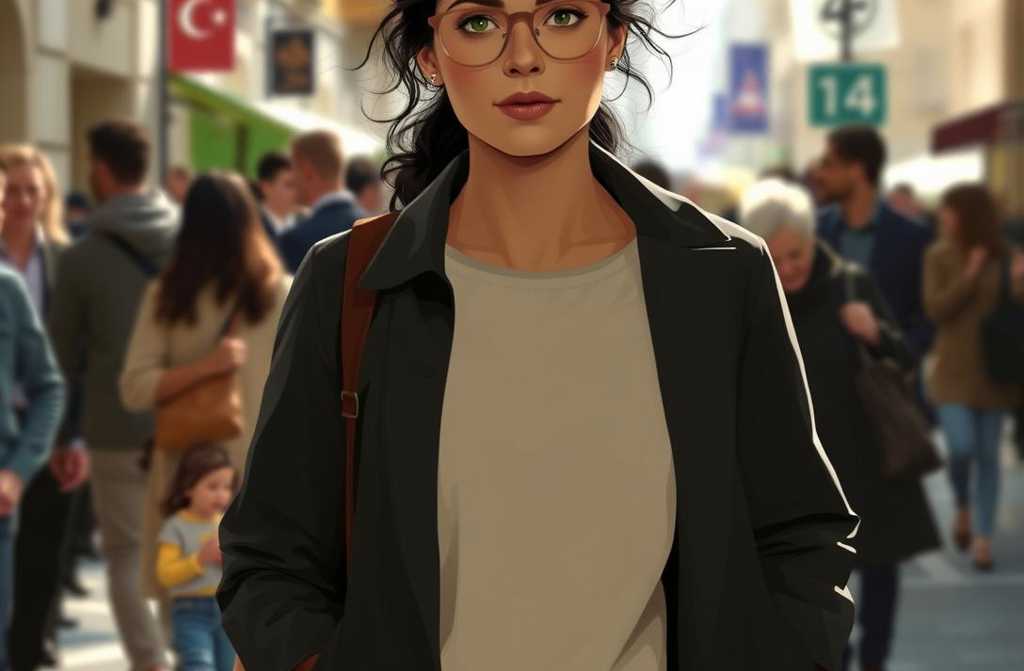 A short denim skirt, skin-tight leggings in metallic silver, pristine white trainers, a crop top with a model’s face printed on it, and a high ponytail tied with a thick scrunchie. Lips painted candy pink, eyes smudged with rainbow shadows. A proper star.