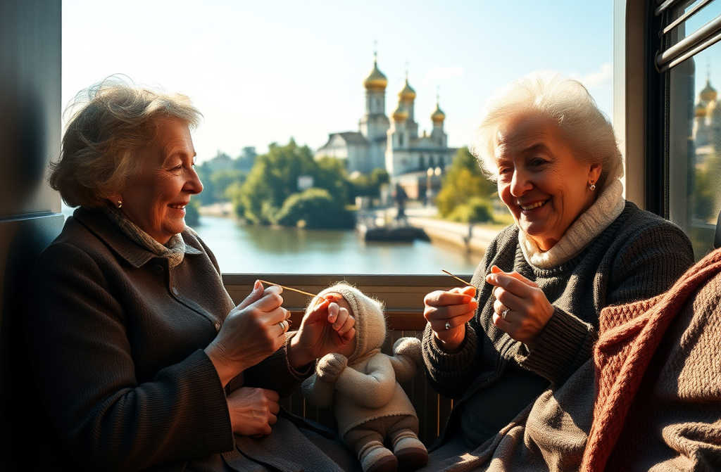 Im sitting on the aisle seat, while in the next compartment, three elderly women are swapping recipes for shortbread and different knitting patterns for socks. The train glides onto a viaduct, revealing a charming scene: clear blue sky, sunlight streaming down, a broad river with gentle ripples. On the far bank, draped in lush grass, stands a white-stone church with a golden spire gleaming in the distance.