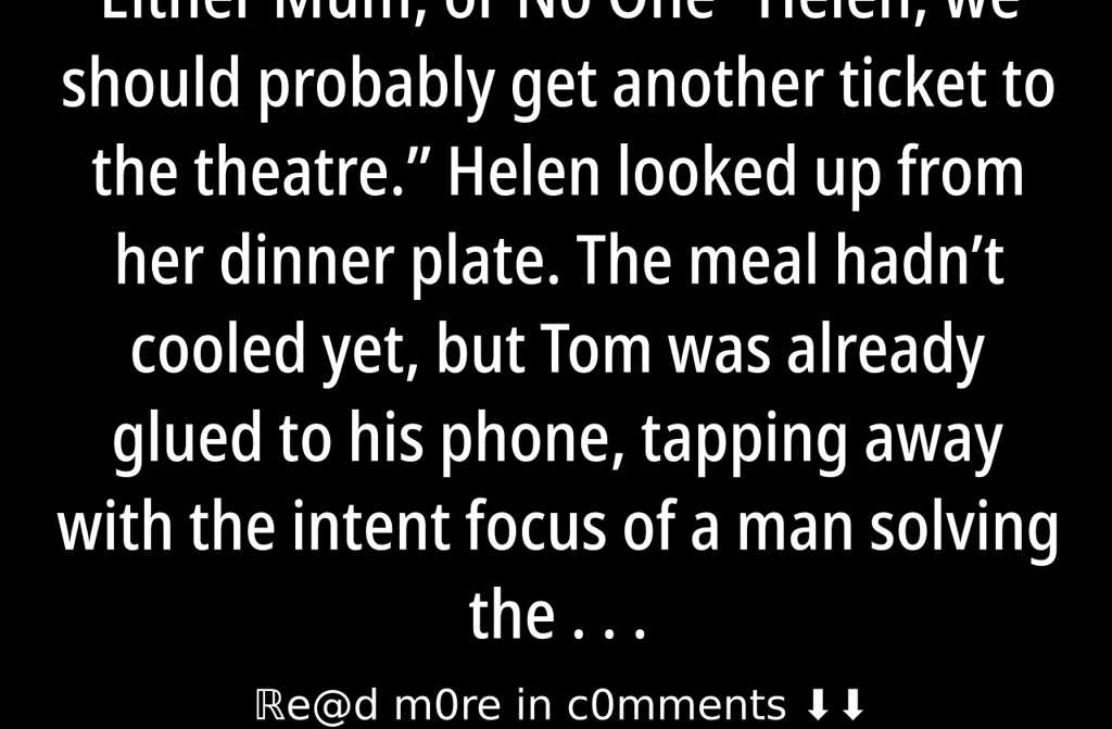 Helen looked up from her dinner plate. The meal hadnt cooled yet, but Tom was already glued to his phone, tapping away with the intent focus of a man solving the nation’s problems.
