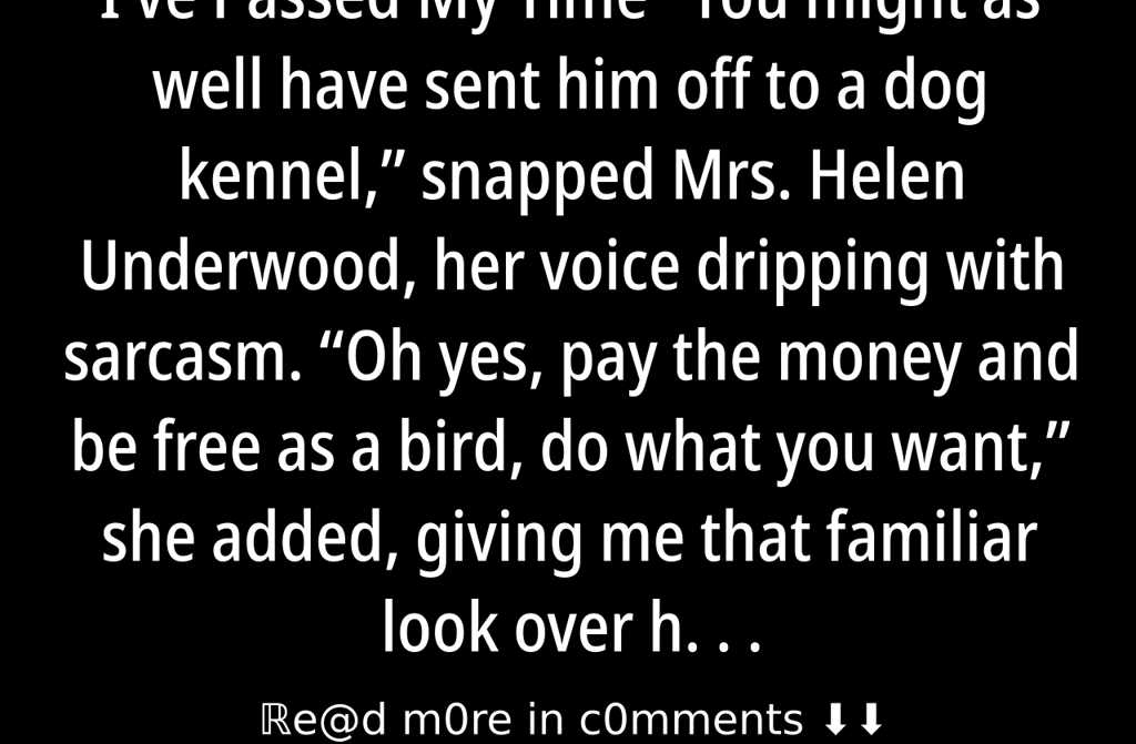You might as well have sent him off to a dog kennel, snapped Mrs. Helen Underwood, her voice dripping with sarcasm. Oh yes, pay the money and be free as a bird, do what you want, she added, giving me that familiar look over her spectacles.